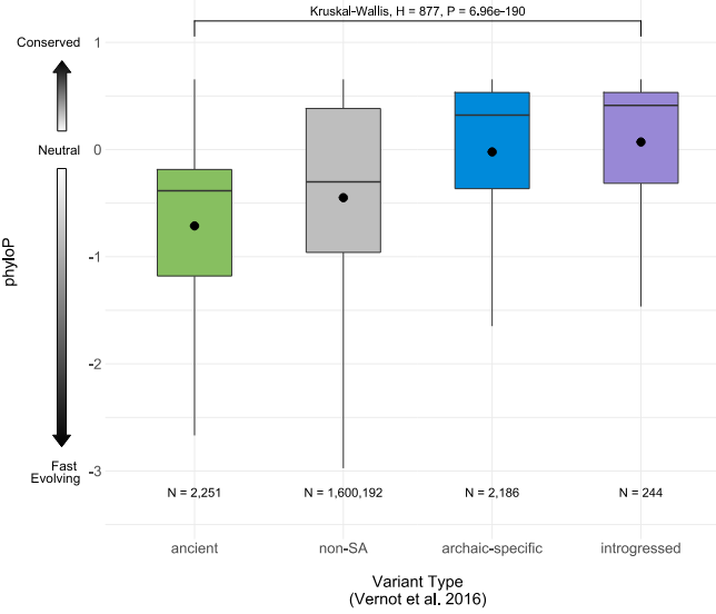 A boxplot comparing the phyloP scores (a measure of genetic changes over time) of three types of SAVs identified along with non-SAV sequences. Image credit: Brand et al., 2023.